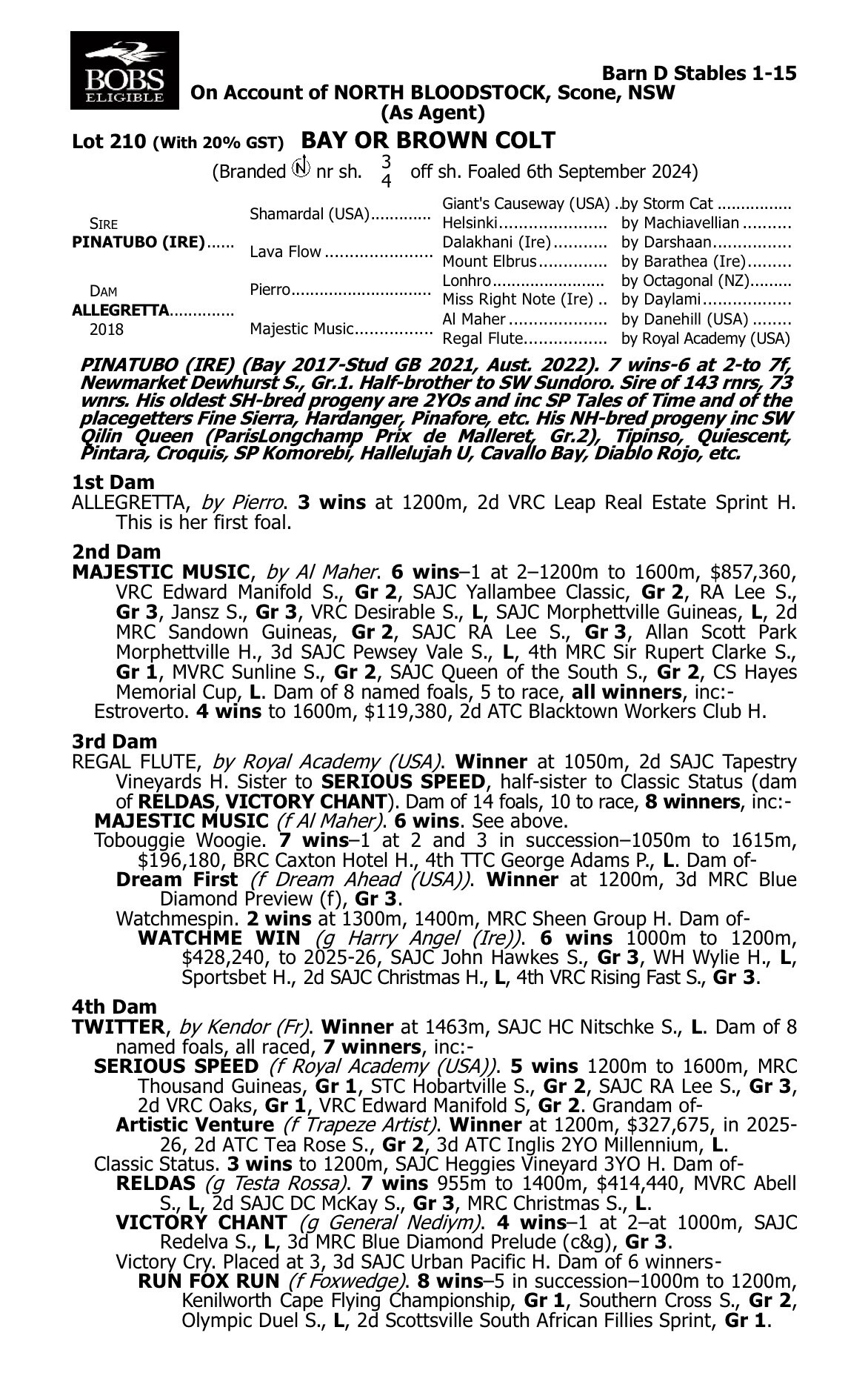 Un-named (Pinatubo – Allegretta) 1 Year Old Bay or Brown Colt ProfilePedigreeEnquire Sire: Pinatubo Colour: Bay or Brown Dam: Allegretta Sex: Colt Age: 1 Foaled: Sep 06, 2024 Country: Australia Silks: First Name (required) Last Name (required) Your Email (required) Phone Message Hello, I'd like to know more regarding the horse Un-named (Pinatubo - Allegretta) you have listed as available. Send Δ