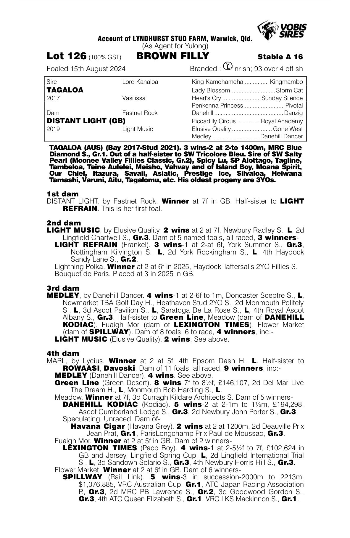 Un-named (Tagaloa – Distant Light) 1 Year Old Brown Filly ProfilePedigreeEnquire Sire: Tagaloa Colour: Brown Dam: Distant Light Sex: Filly Age: 1 Foaled: Aug 15, 2024 Country: Australia Silks: First Name (required) Last Name (required) Your Email (required) Phone Message Hello, I'd like to know more regarding the horse Un-named (Tagaloa - Distant Light) you have listed as available. Send Δ